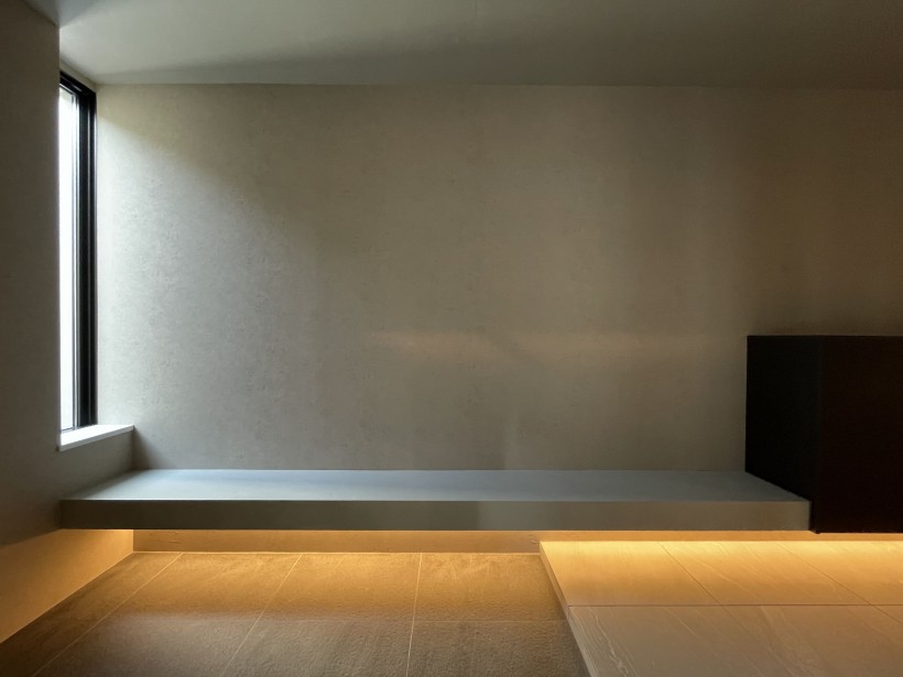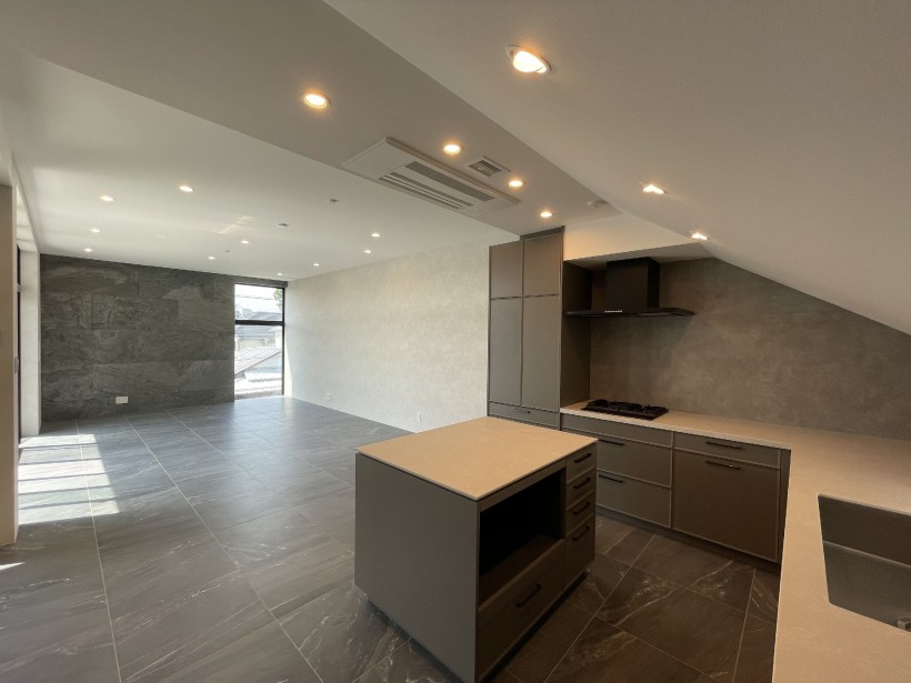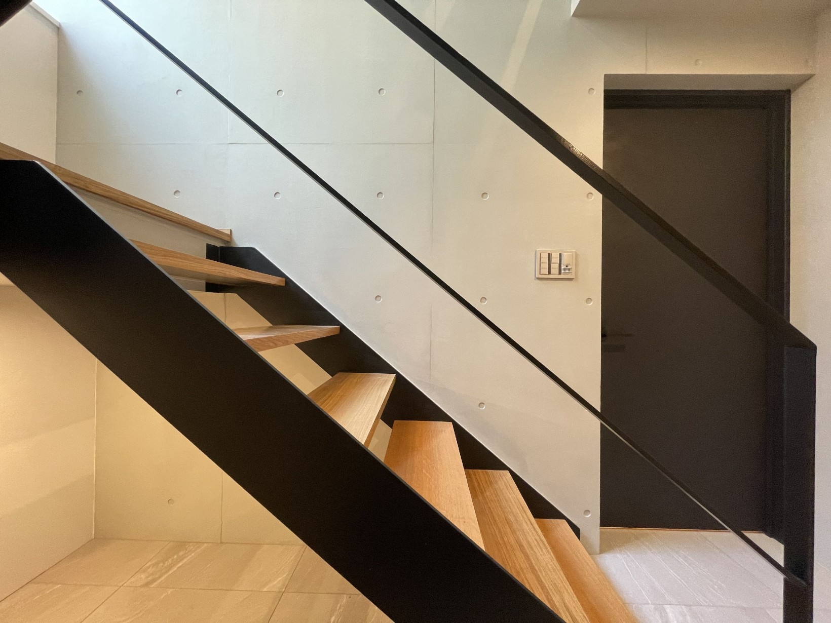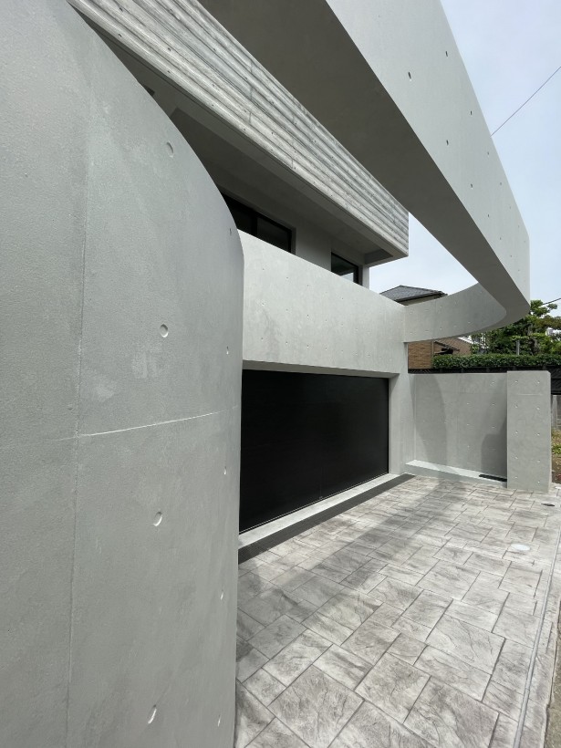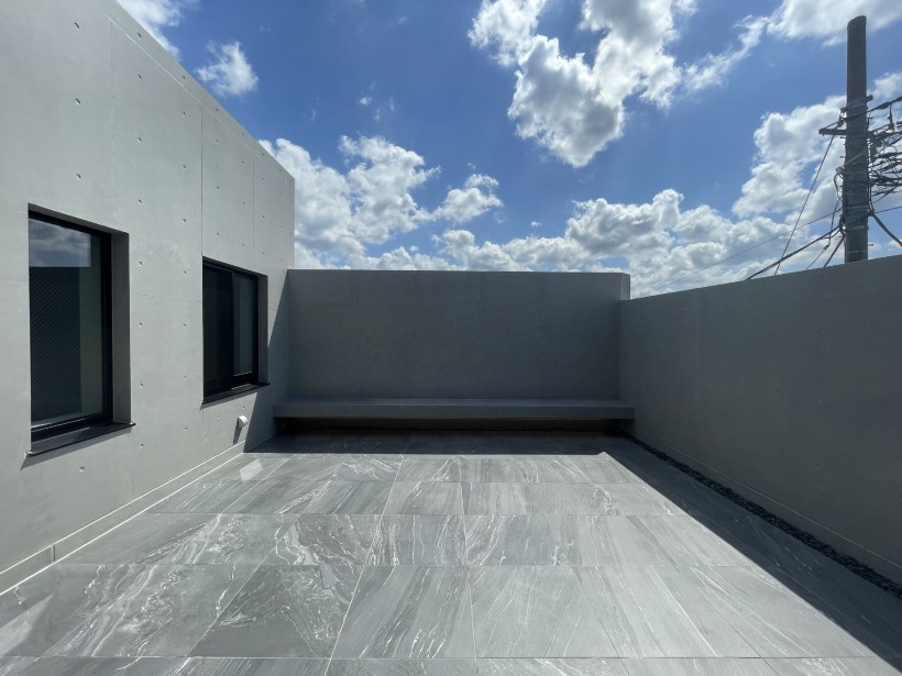また盛り土の上に建つ家々が並ぶ地域の特性を生かし、道路からのアプローチで降りる高さを抑えた玄関や車庫の地下1階空間と天井高さが通常より高い最上階のリビングダイニングを一体感のある広いバルコニーと共に実現した実例でもある。