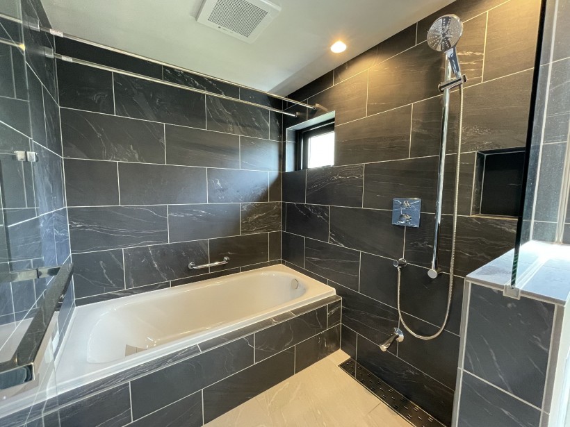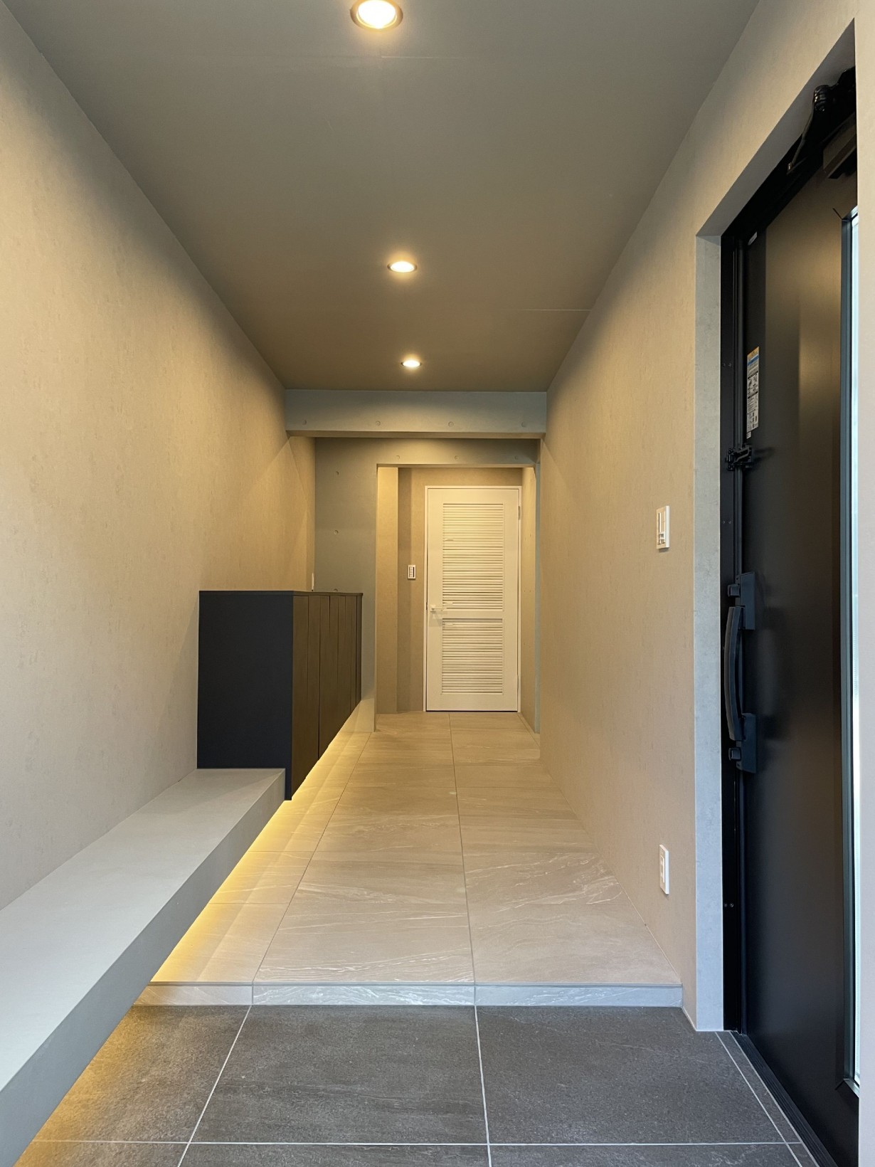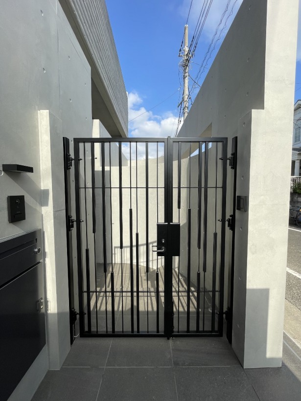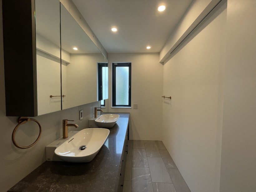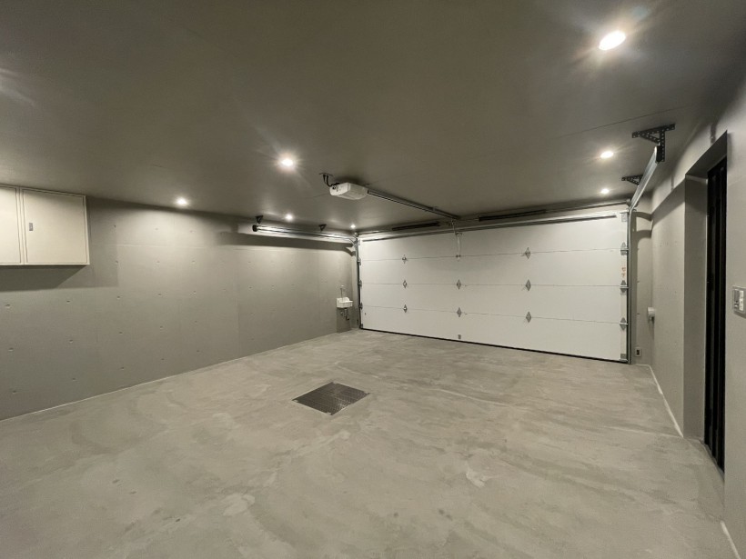また盛り土の上に建つ家々が並ぶ地域の特性を生かし、道路からのアプローチで降りる高さを抑えた玄関や車庫の地下1階空間と天井高さが通常より高い最上階のリビングダイニングを一体感のある広いバルコニーと共に実現した実例でもある。