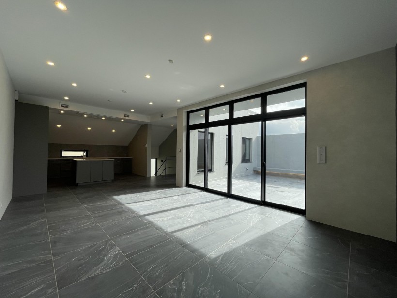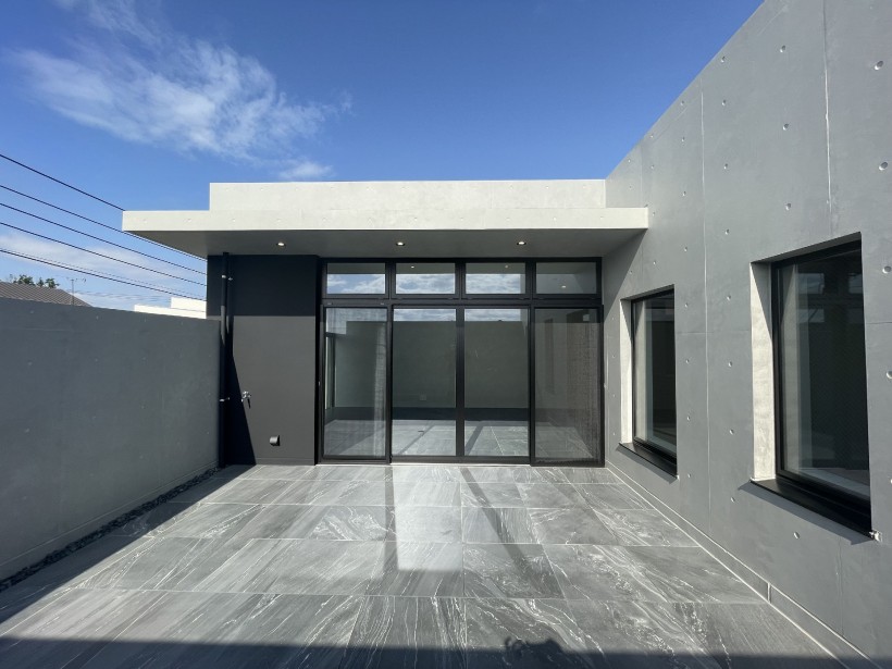 高さの高いコンクリートの手摺壁でお隣からの視線を断ちカーテン無しで外空間を感じることのできるLDK空間を実現した実例。