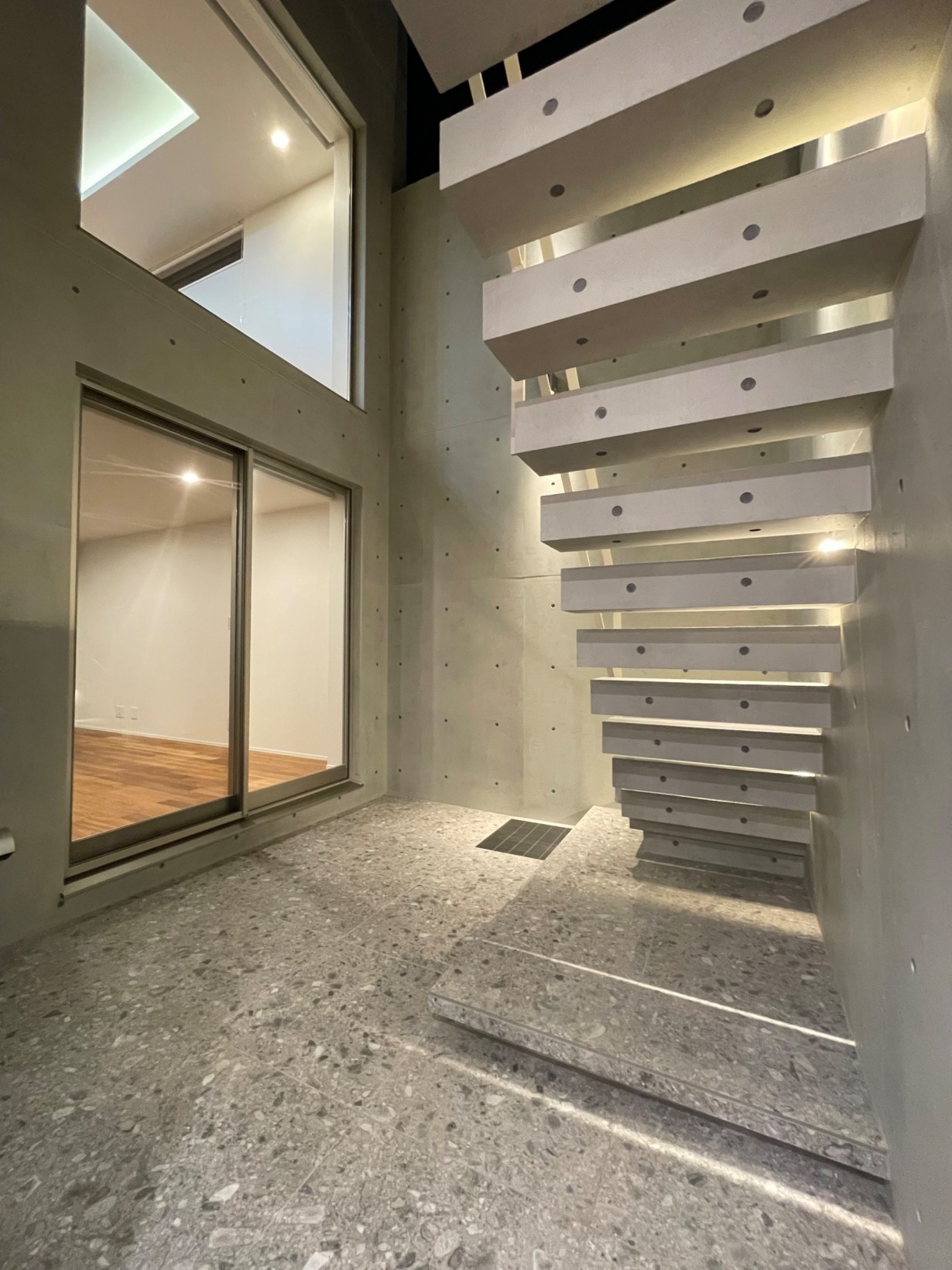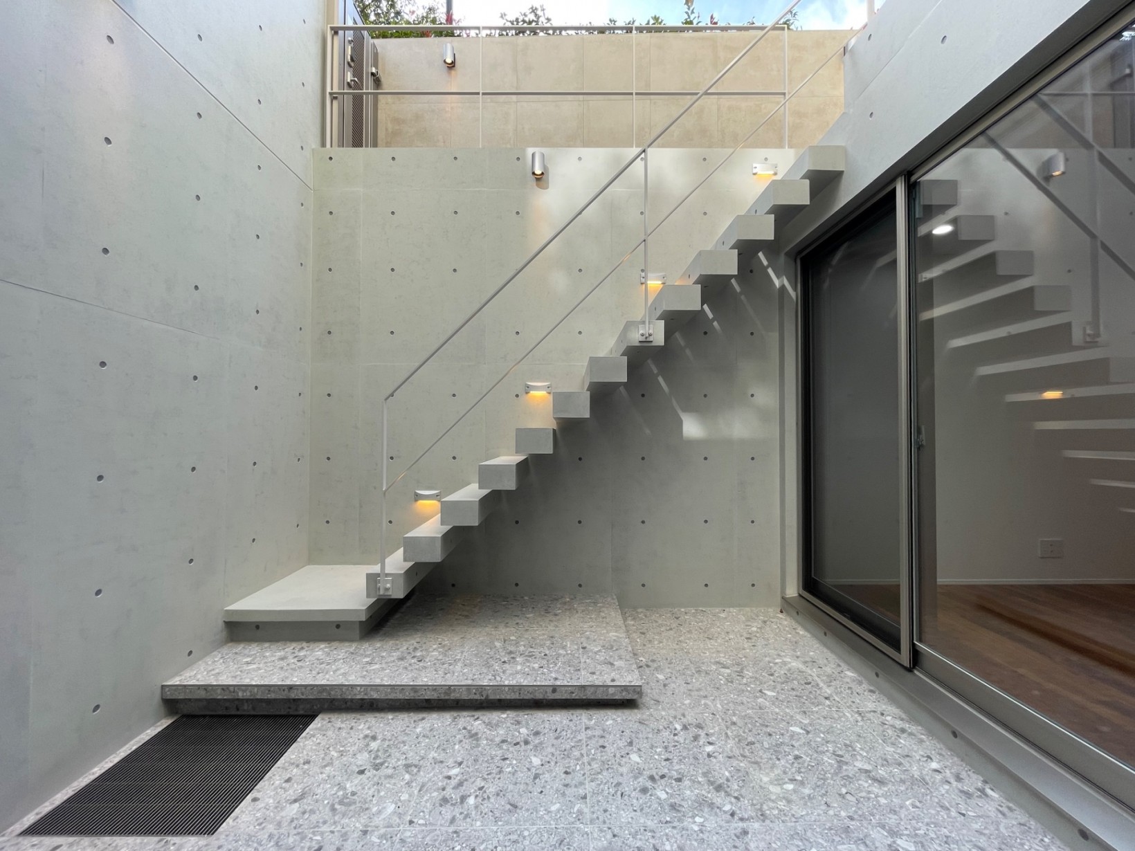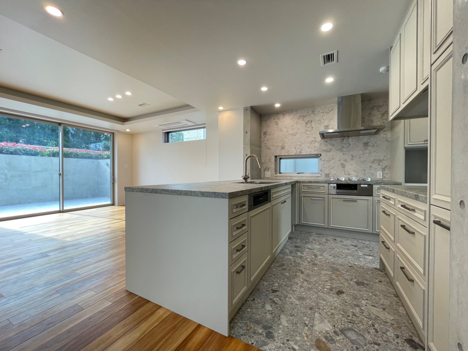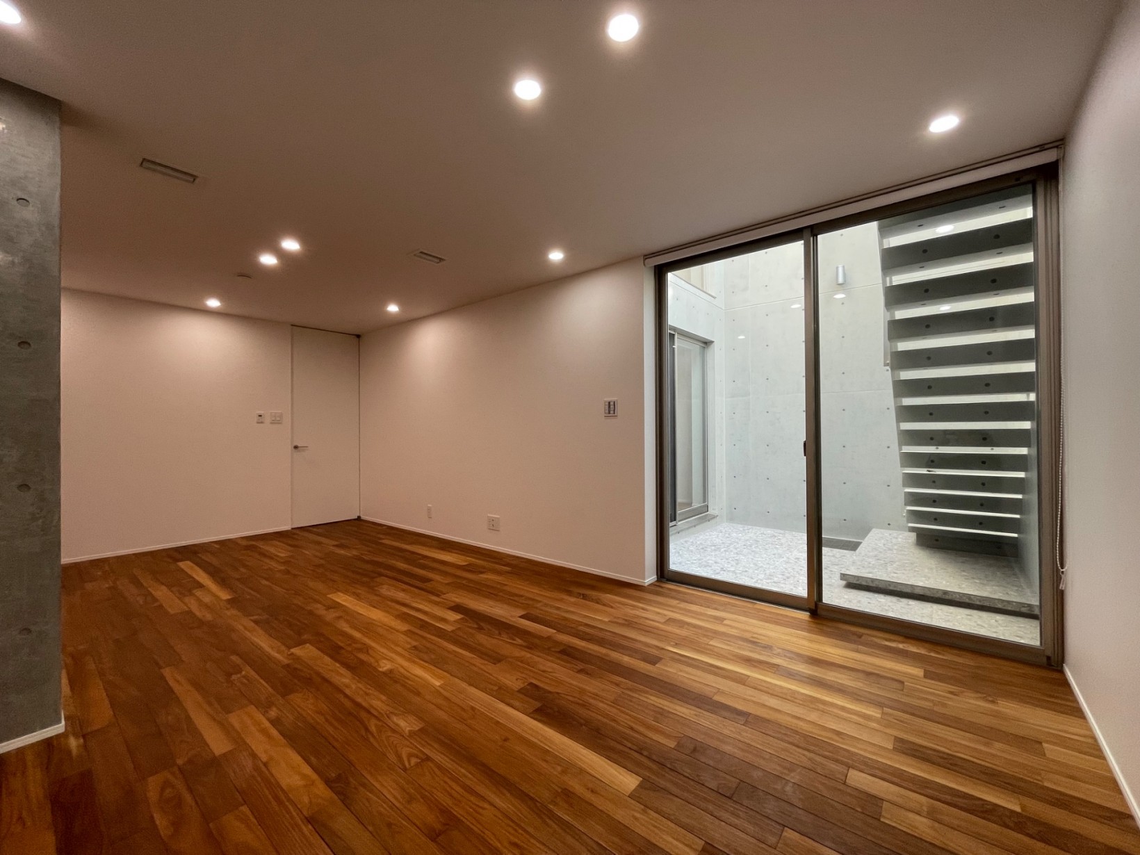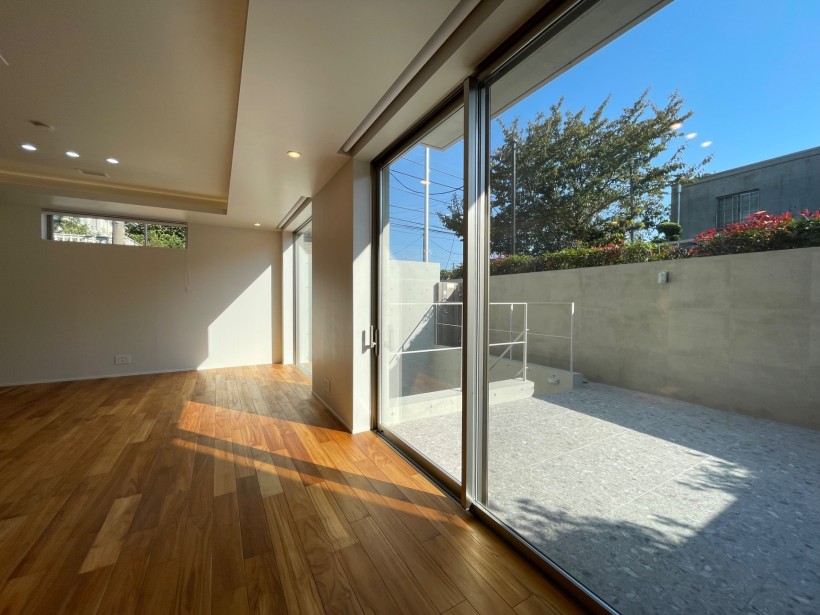 1階にLDKを配置し地下のパティオと1階のバルコニーの外空間をとりこみ、より広さを感じるLDKを実現した実例。