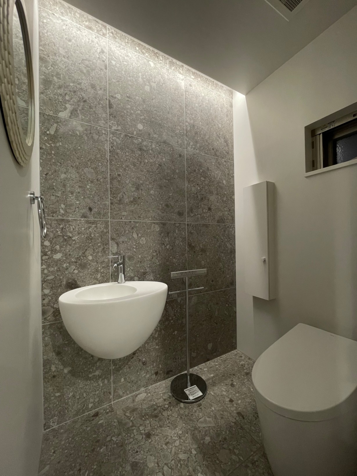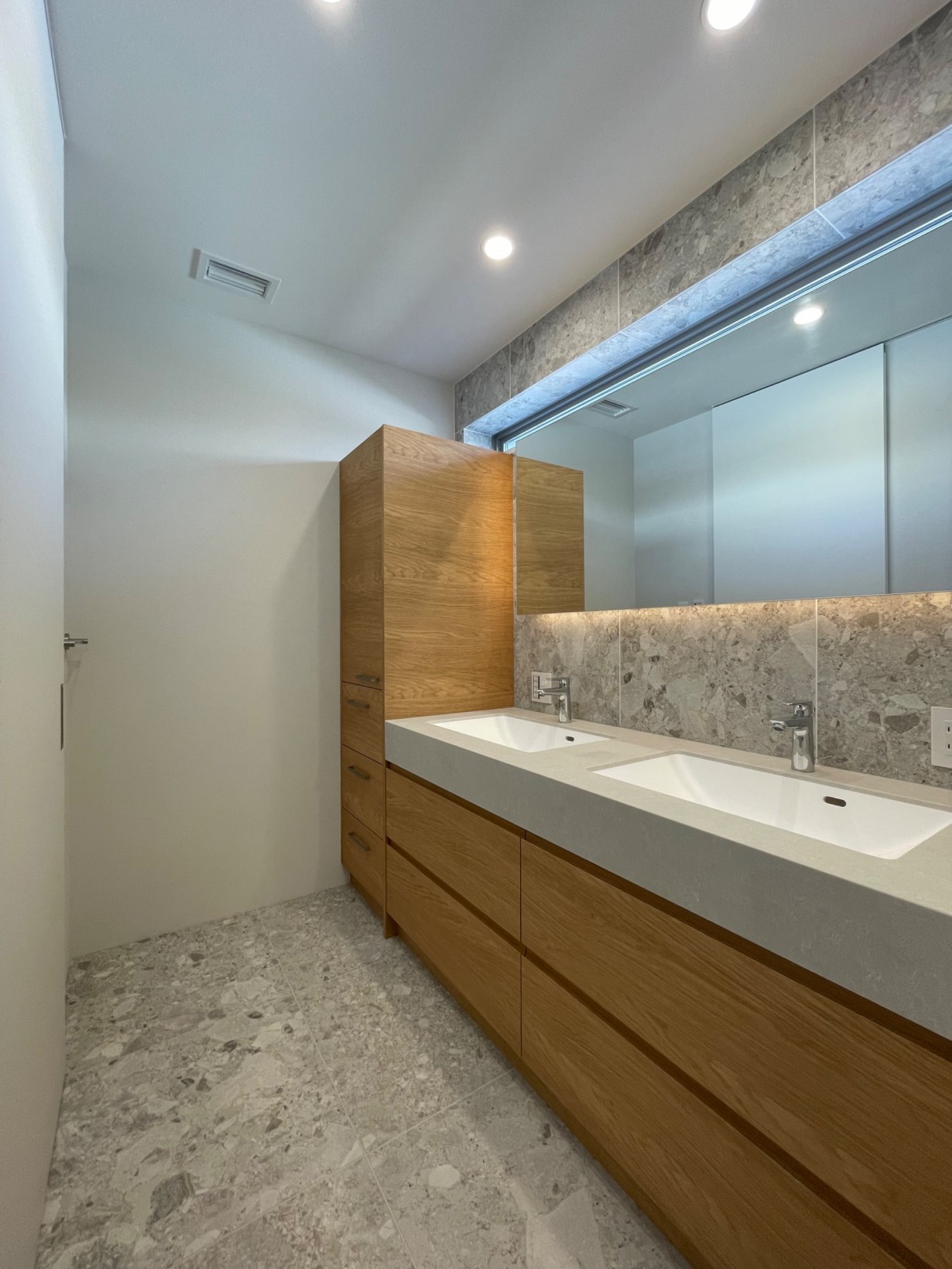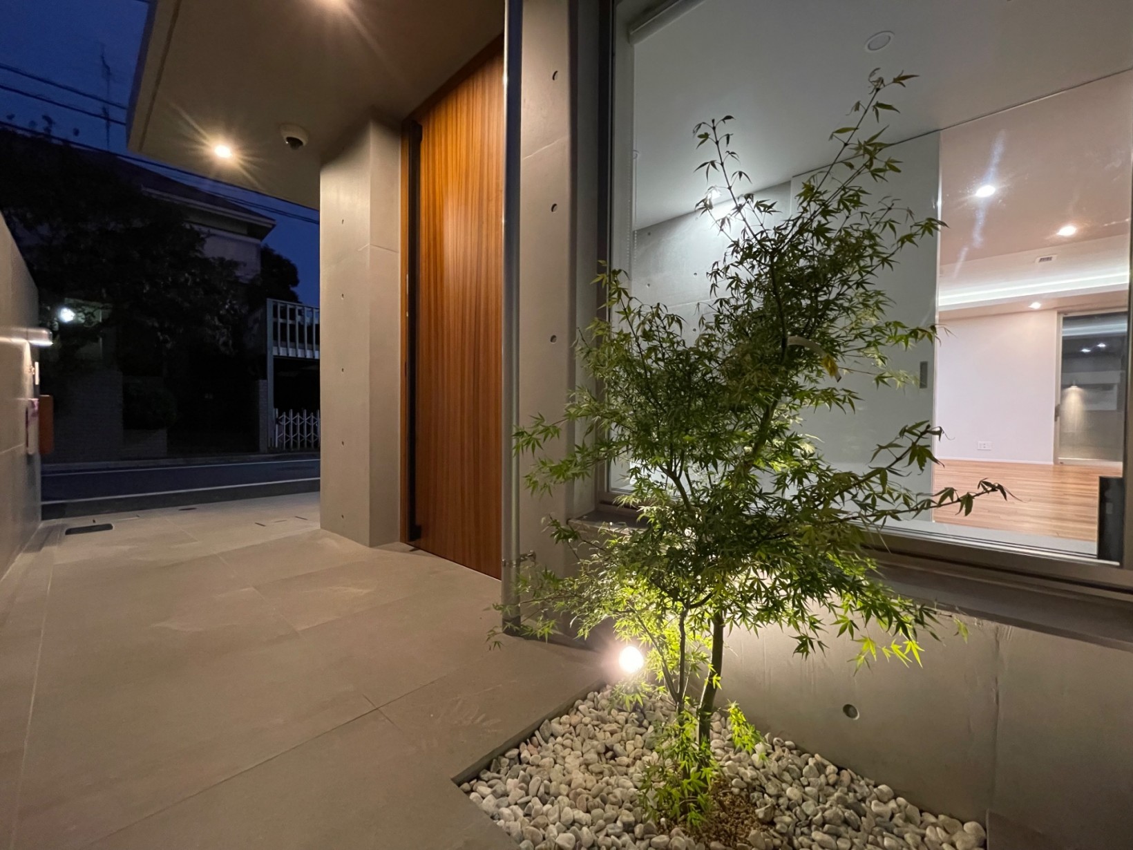 割れ石調のタイルとぬくもりのある無垢床との対比を楽しめる奥様の拘りの詰まった邸宅ができあがりました。